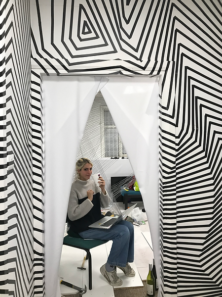 I painted all the walls white and used black electrical tape to create the illusionary bending effect. the window ledges, corners and radiator become lost in the black lines. Especially as the reflective floor mirrors these lines as well. Viewers were invited to wear a virtual reality headset which played a looping illusionary animation. Once they had watched this in the closed off environment of the headspace they then were exposed to the full scale of the room. As id they had stepped into the illusion in the animation.